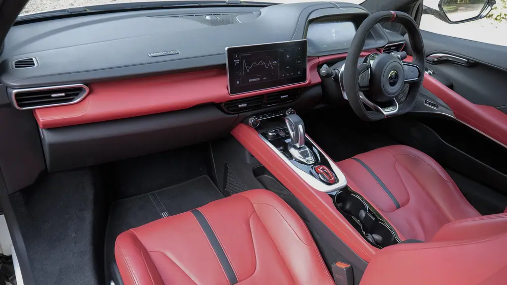We wish this is what the old Evora had looked like. The Emira is gorgeous, no question. If you choose it over its two main rivals, it'll be because you think it looks more exotic than a Porsche 718 Cayman (true) and more aggressive than an Alpine A110 (also true). You might even, like us, see shades of Ferrari 458 Italia here. And all those ducts and scoops are absolutely functional. Yet the lottery-level looks haven't come at the expense of practicality. On the contrary, this is the easiest Lotus sports car in history to get in and out of, though the wide door sills mean that access and exit still aren't as straightforward as they would be in an Alpine or a Cayman. Once at the wheel, you sit low in front of an octagonally-shaped wheel decorated with buttons that are all too easy to inadvertently knock as you turn it. For the first time in a Lotus, you start the car with a button, this one embellished with a red flap. And the column stalks are borrowed from fellow Geely brand Volvo. Ahead of you are two digital screens, one 12.3-inch display for the instruments, the other 10.25-inch monitor in the centre of the dash for infotainment; graphics are minimalist and climate functions are separated out into proper buttons. Unlike in the old Evora, there are no tiny 911-style rear seats; so you can squash luggage in the 208-litre space behind the front chairs as well as in the compact 151-litre boot. Unlike in a Cayman, there's no extra 'frunk' beneath the bonnet; that's due to crash structure demands.